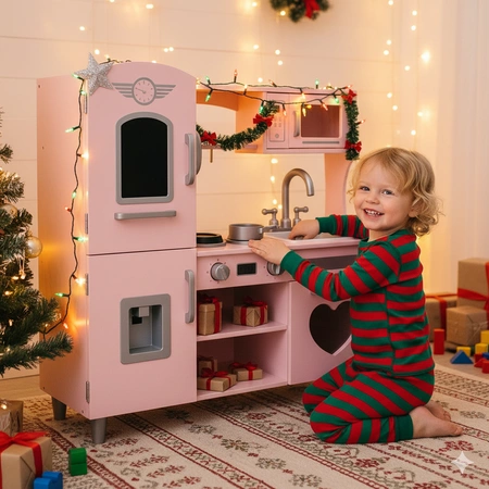 Drewniana kuchnia SUGAR z elektrycznym dozownikiem wody – różowa kuchnia dla dzieci z mikrofalą, lodówką i zlewem