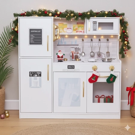 - Uniwersalne kolory i wzornictwo sprawiają, że drewniane kuchnie dla dzieci pasują do każdego pokoju.